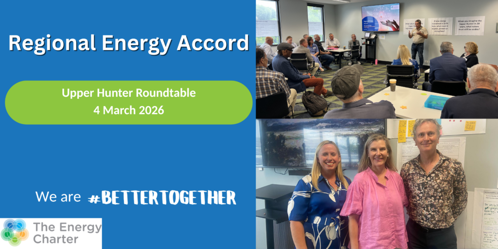 The Regional Energy Accord Roundtables are the foundation for genuine collaboration between energy business and communities and co-designing a framework that transforms how the energy sector engages with and delivers lasting benefit to regional Australia. Through these workshops, we’re building a unified vision that ensures regional voices help shape Australia’s clean energy future, creating shared value for all.